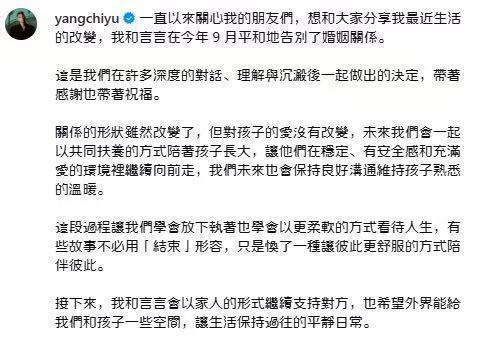 婚姻的契约解除了,但他们的“育儿群”没有解散。 12月8日,棒棒堂成员小煜(杨奇煜)的一纸离婚声明,没有狗血剧情,没有互撕指责,平静得像在讲述别人的故事。 他在长文里写道,和妻子言言在今年9月就已经和平分开,关系的形状变了,但对两个孩子的爱一点没变。 未来,他们将以“共同抚养”的方式,一起陪着孩子长大。 这份声明,让一场明星离婚案,跳出了娱乐八卦的范畴,成了许多人讨论亲密关系与家庭责任的新样本。